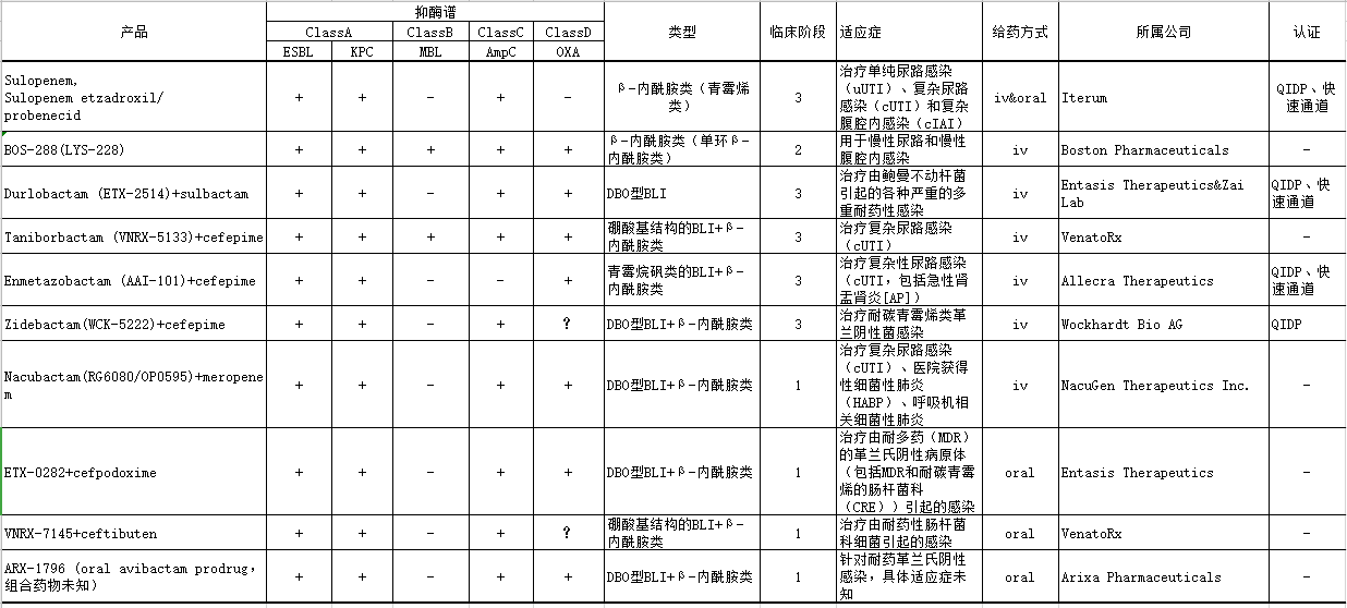 本文将重点分析正处于临床试验中对多重耐药菌具有活性的β-内酰胺类抗生素及含β-内酰胺酶抑制剂的复合抗生素,对于其他正处于临床试验中的新型抗生素我们将在后续系列文章中进行分析。